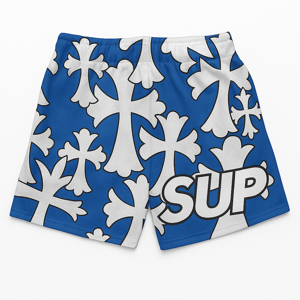 These Crosses shorts in royal blue and white feature breathable mesh fabric for optimal ventilation. Equipped with convenient pockets and adjustable drawstrings, they offer practical storage and a customizable fit. Note that the sizing runs smaller than usual, so consider sizing up for the best comfort and performance. Ideal for active wear with a focus on both function and style.