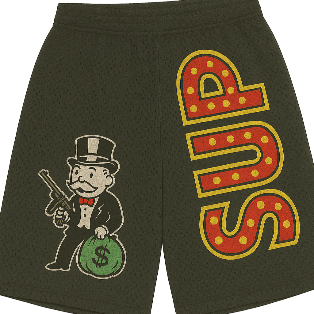 The Monopoly Gangster shorts offer a stylish and functional design with five convenient pockets and adjustable drawstrings for a perfect fit. Crafted to run smaller than standard sizing, we recommend sizing up to ensure comfort. These shorts combine practicality with a sleek look, making them an excellent choice for everyday wear.